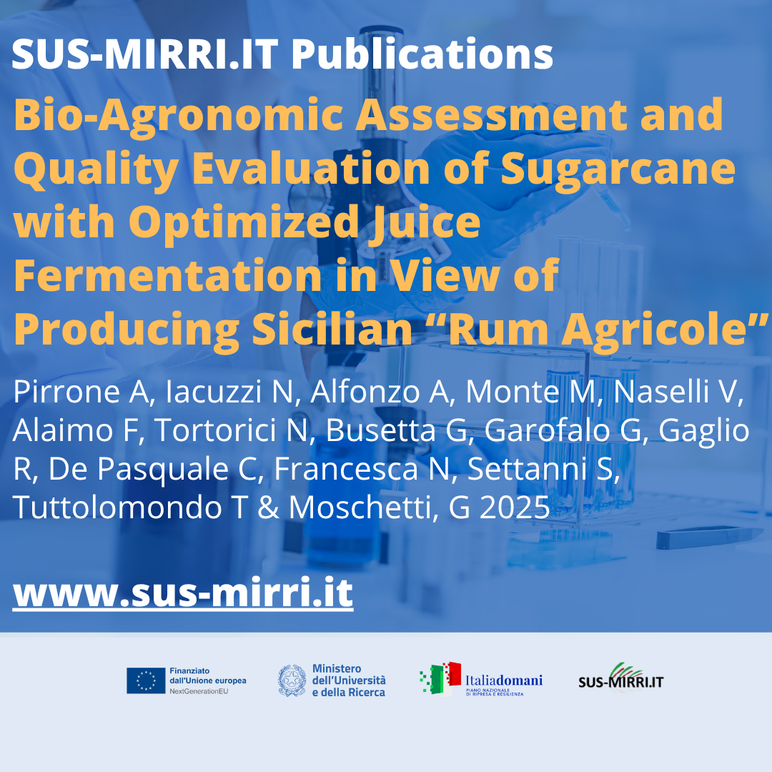 Pirrone A, Iacuzzi N, Alfonzo A, Monte M, Naselli V, Alaimo F, Tortorici N, Busetta G, Garofalo G, Gaglio R, De Pasquale C, Francesca N, Settanni S, Tuttolomondo T & Moschetti, G 2025 Bio-Agronomic Assessment and Quality Evaluation of Sugarcane with Optimized Juice Fermentation in View of Producing Sicilian “Rum Agricole”. Applied Science 15(14) 7696 https://doi.org/10.3390/app15147696