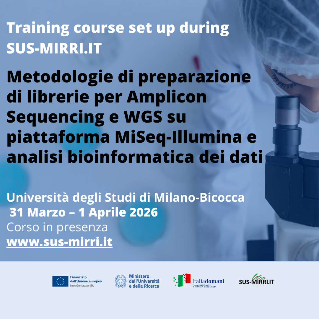 Nell’ambito delle attività formative del progetto SUS-MIRRI.IT, l’Università degli Studi di Milano-Bicocca organizza un training course in presenza dedicato alle metodologie di Amplicon Sequencing e Whole Genome Sequencing (WGS) su piattaforma MiSeq-Illumina, con un focus pratico anche sull’analisi bioinformatica dei dati.