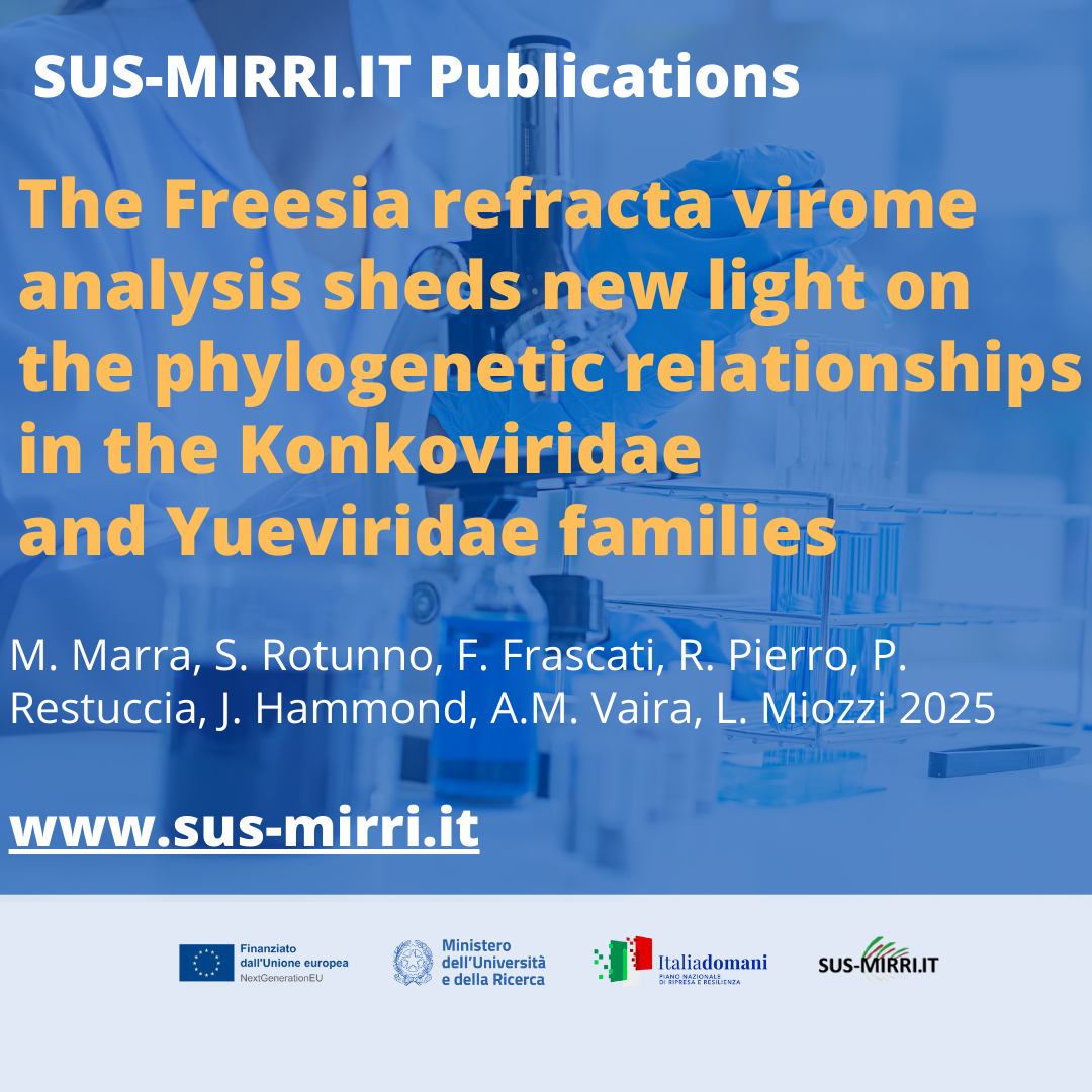 M. Marra, S. Rotunno, F. Frascati, R. Pierro, P. Restuccia, J. Hammond, A.M. Vaira, L. Miozzi 2025 The Freesia refracta virome analysis sheds new light on the phylogenetic relationships in the Konkoviridae and Yueviridae families. bioRxiv 644121 https://doi.org/10.1101/2025.03.19.644121;